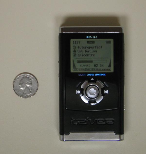 The iRiver H140 (previously known as the iHP-140) is basically an iPod clone. It's roughly the same size as the iPod (2.36" wide, 0.95" thick and 4.13" tall, weighs 6.5 ounces). In addition to a 40GB disk, it has an FM tuner, analog and digital line in and out, plays MP3, WAV, ASF, WMA and (most importantly) Ogg audio files. You can read text files on the screen and record directly to MP3 or WAV from the built-in microphone or line in.